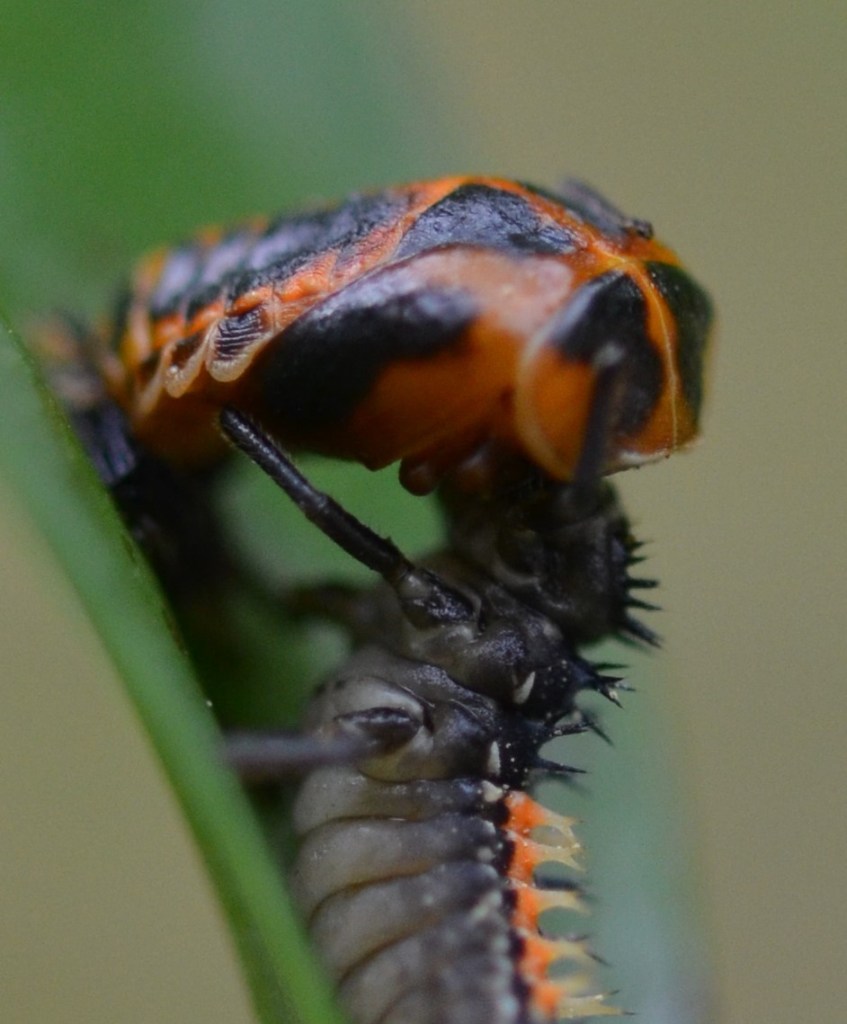 Die Larve des Asiatischen Marienkäfers überwältigt ihre nächste Stufe der Marienkäferentwicklung, die Puppe.
