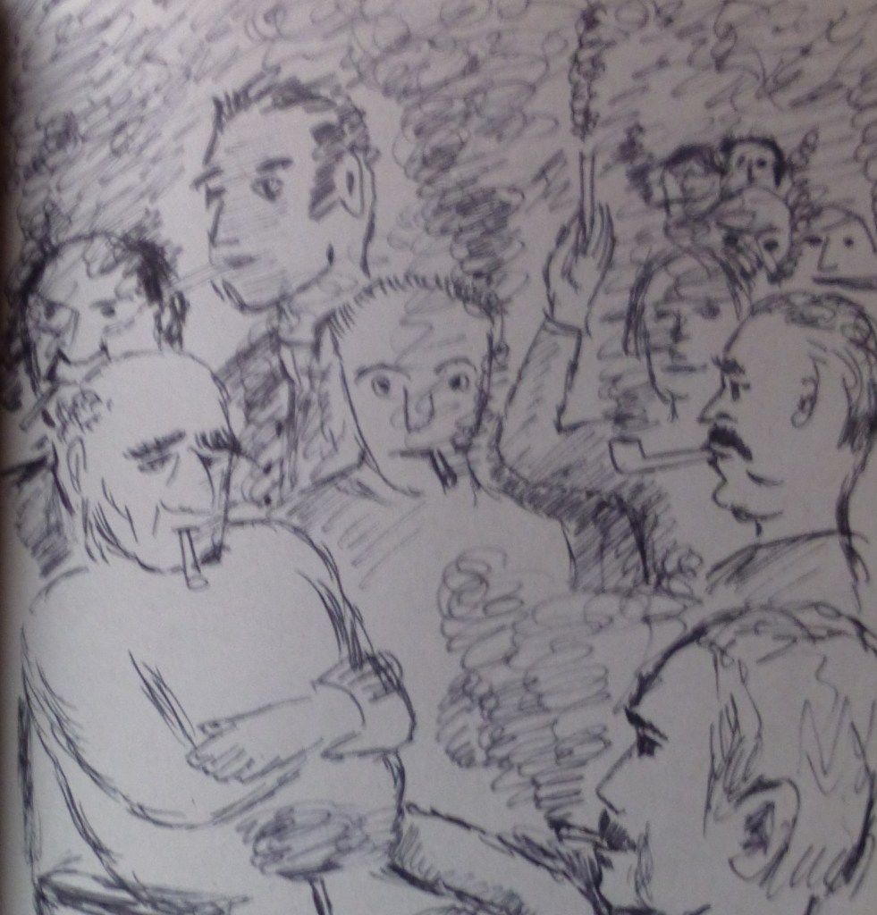 Der Rauch wallte durch die Örtlichkeit, dummdösig war das. Wie auf einem Genrebild, man müsste es zeichnen.