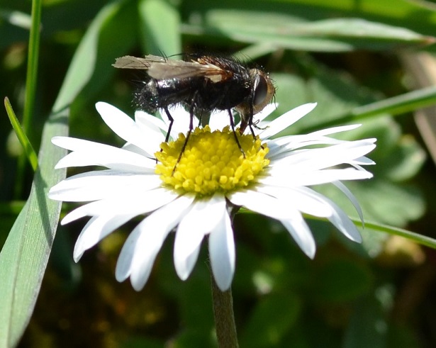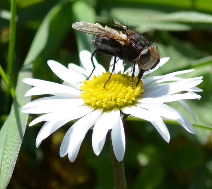 Die Fliege war geduldig und graste das Gänseblümchen, sich im Kreise drehend, ordentlich ab.
