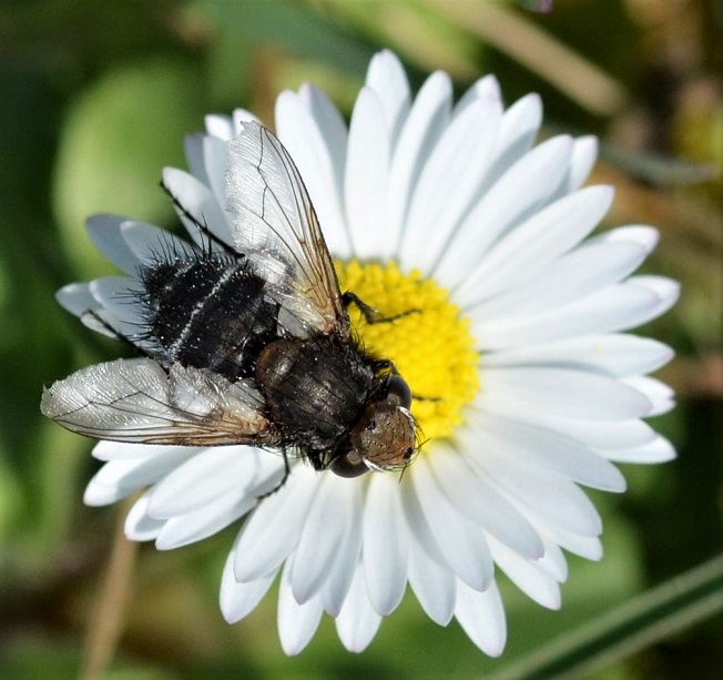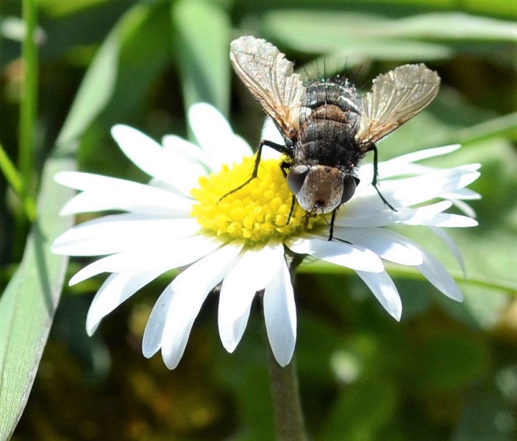 Auf einem Gänseblümchen fiel mir eine ganz besondere Fliege auf, die ich so nicht zu kennen schien. Also machte ich noch eine Reihe von Aufnahmen.