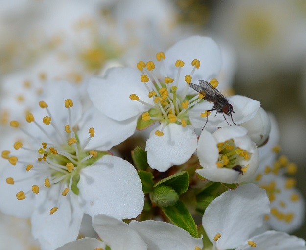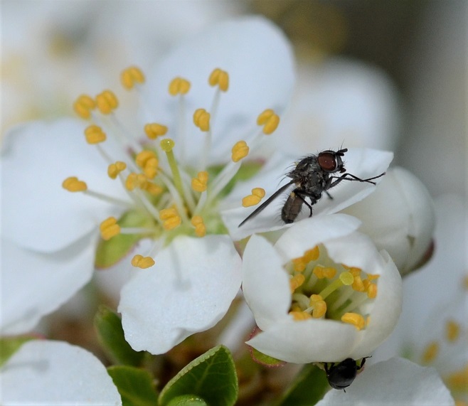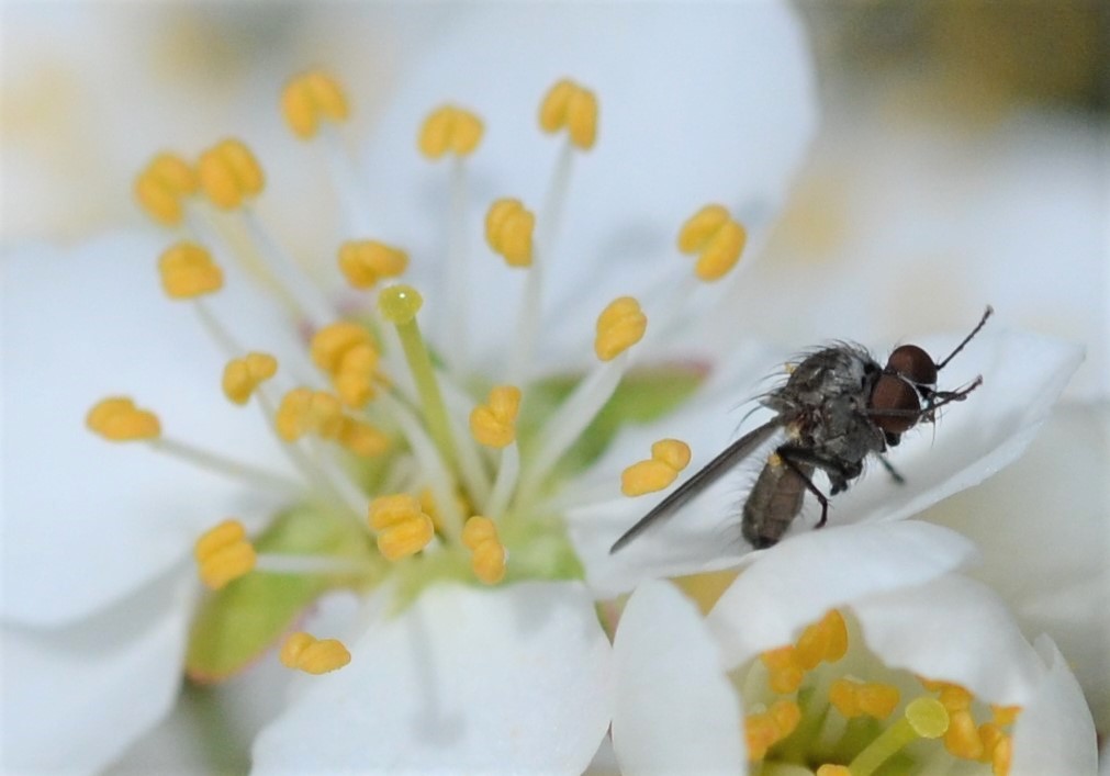 Eine winzige schwarze Fliege auf einer Kischblüte…