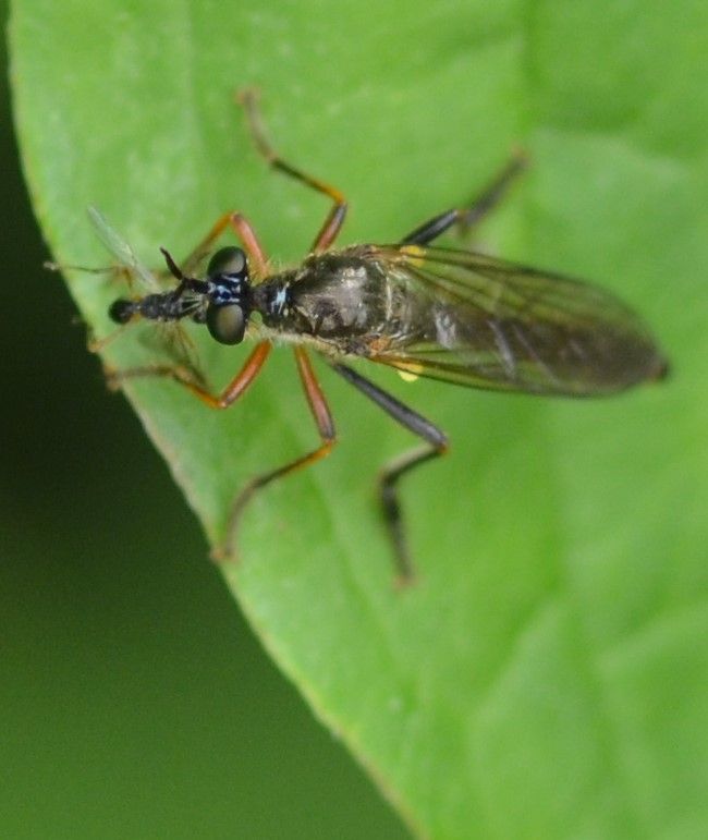 Raubfliege Dioctria rufipes mit Minifliegenopfer