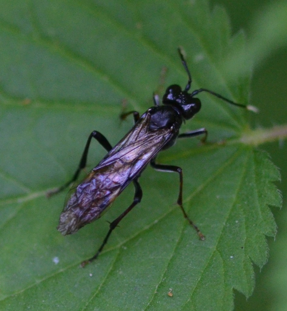 Die winzige jüngere Larve des Barbitistes serricauda (Laubholz-Säbelschrecke). Sie treibt sich auf einem Blatt herum, das wie eine Müllhalde aussieht. Zudem stehen überall wie ein Spalier Haare hoch. Diese Larve würde wohl sagen: Ich lebe in einem Haarwald, was ist denn eigentlich … ein Blatt?Diese Echte Blattwespe (Tenthredo (Tenthredella) livida) liebt den Knitterlook. Offensichtlich spart sie sich das Glätten nach dem Landen. Sie kann auch so fliegen.Ein recht dunkles Rot, wie mir scheint, zeigt dieser Marienkäfer hier. Oder war es hier generell dunkel? Ich glaube nicht.