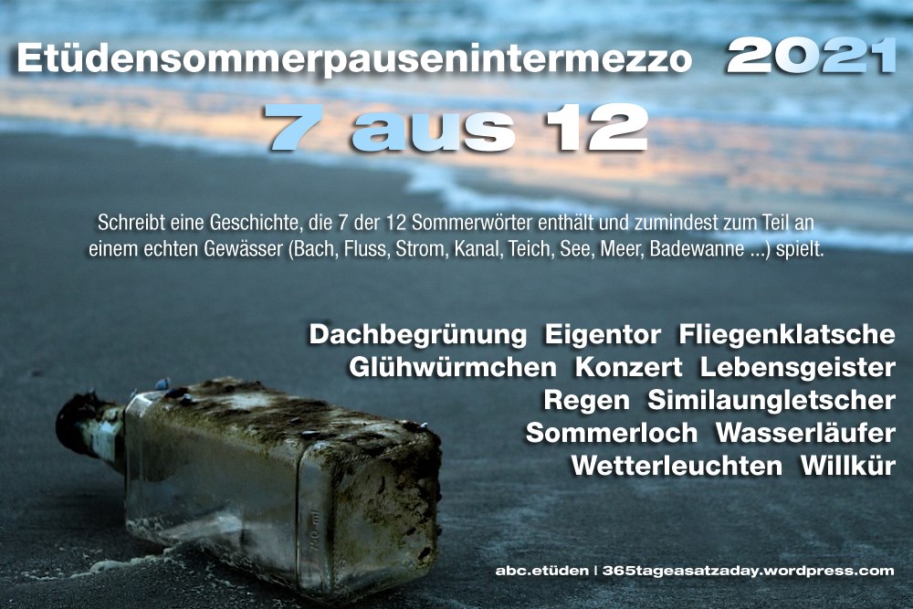 Christiane lud ein und da kann ich nicht umhin, auch einen längeren Text abzuliefern und dabei mindestens 7 der vorgegebenen Worte zu verwenden. Ich nahm alle 12. Und ein Teich ist auch dabei, mittig im Text 🙂
