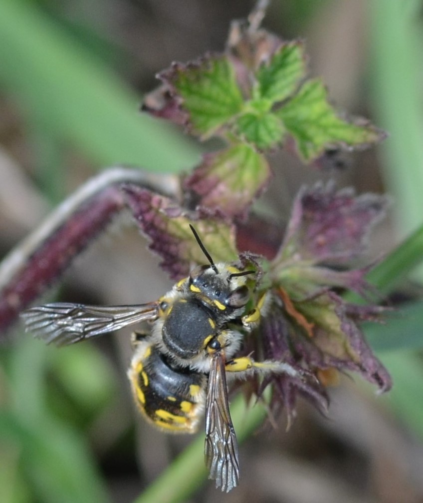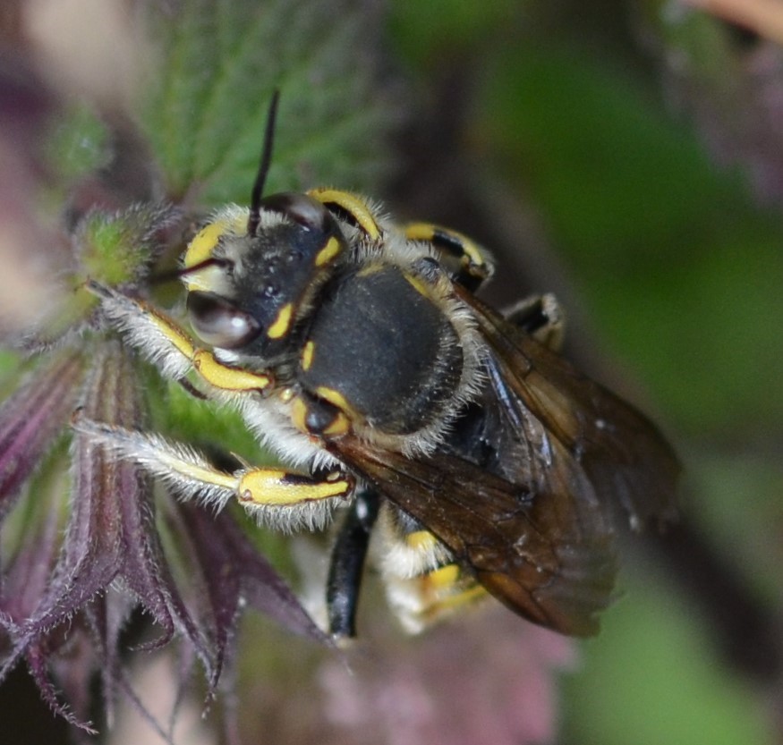 Die Wollbiene, an der Schwarznessel wohl, glänzt mit ihren Augen.