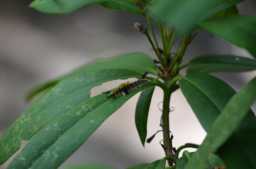 Was macht bloß ein Schlehenbürstenspinner im Rhododendron? Er hat sich wohl verbürstet …