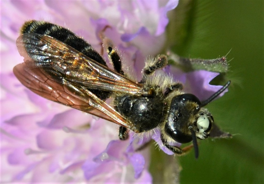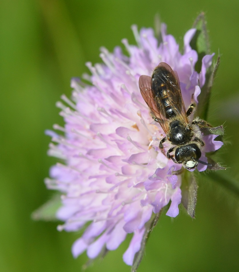 Fantastisch diese Bilder der Maskenbiene auf der Skabiose und dieses Muster am Kopf sieht tatsächlich aus wie eine Maske!