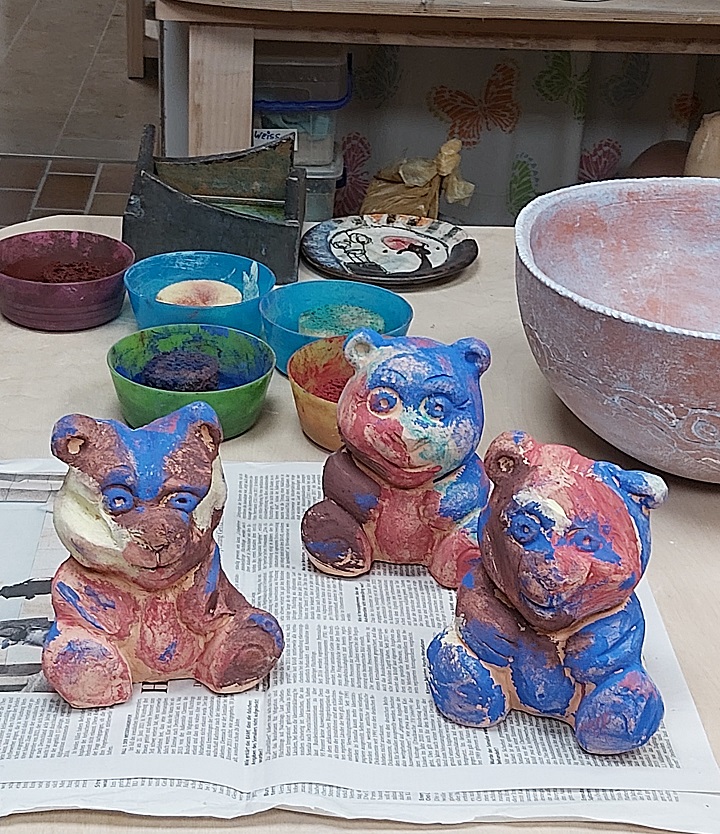 Bärenbuntes Vergnügen, hoffe ich und bin gespannt, wie sie nach dem Brennen aussehen werden.