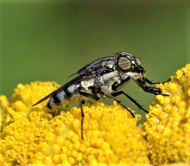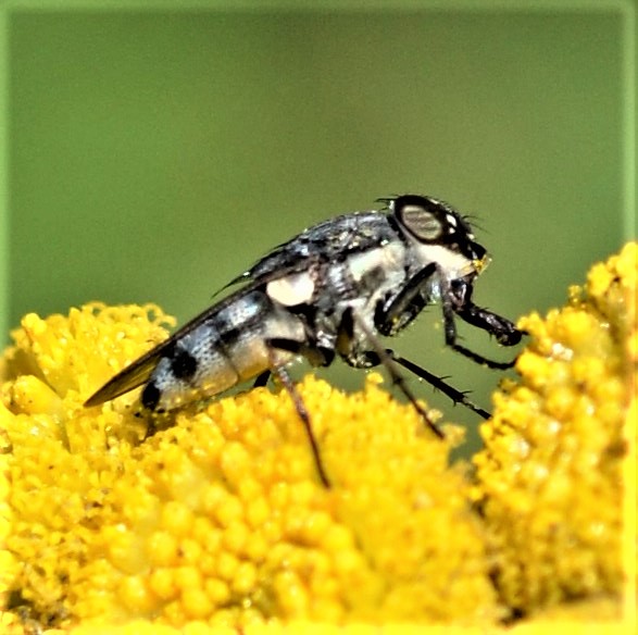Eine kleine Stomorhina lunata auf Rainfarn.