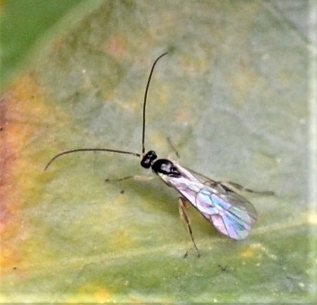 Die sehr zierliche Brackwespe hier zeigt sich nur ab und an. Sie überlässt Fliegen und Wespen das Terrain.
