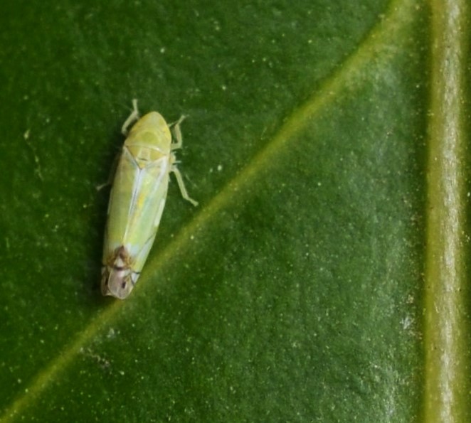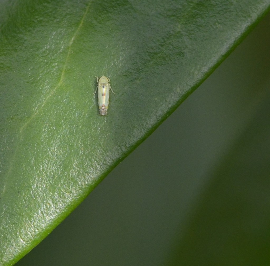 Auf dem Lorbeer finde ich oft die Diadem-Blattzikade vor. Sie ist etwa 1 mm breit und 3-4 mm lang.