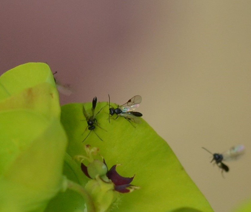 Lysiphlebus testaceipes (3 mm Länge) auf der Wolfsmilch, auch wenn es nur Gelbgrün ist..