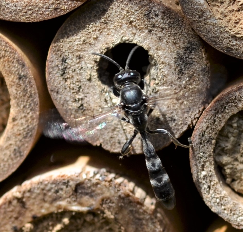 Das gibt es doch nicht, lach. Ich glaube, du hast die Grabwespenart so toll erwischt, die hier bei mir nistet. Ich konnte sie auch nicht zuordnen. Meine hat aber auch die Streifen auf dem Hinterleib. Witzig und ein schönes Foto.