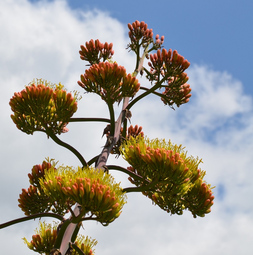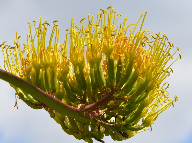 Dieses Phänomen habe ich früher immer wieder auf meiner damaligen Lieblingsinsel Formentera beobachten können. Irgendwo blühte immer eine Agave. Die ausgeblühten verholzten Stämme standen dann oft noch jahrelang wie windschiefe Telegrafenmasten in der Landschaft…