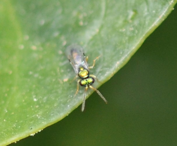 Ein 1 – 2 mm großes Ding, zu den Erzwespen gehörend, hat Interesse an zusammengeschnurten Spinnweben.