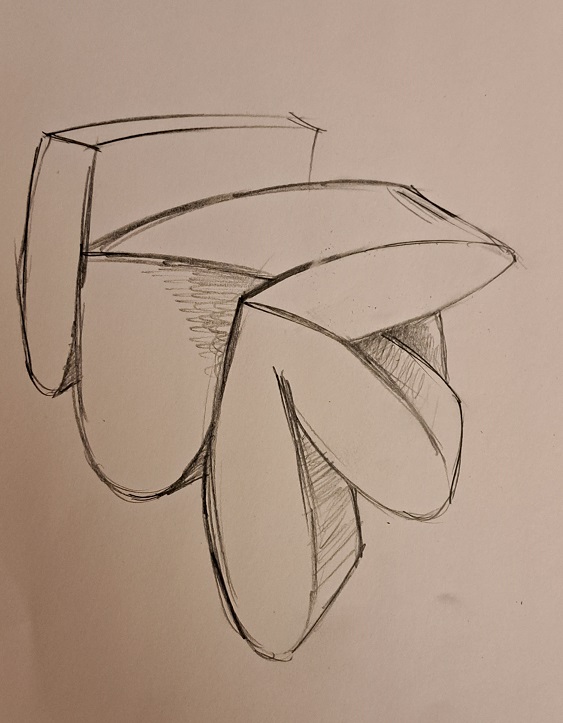 Eingeschriebene Ellipsoiden sind das bei der ersten Zeichnung. Die Wände dieser Elipsoiden sind gekrümmte, unter Spannung stehende Bögen. Ich mag diese Grundform, so wie ich früher gerne Rauten zeichnete.