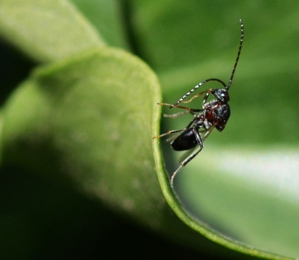 Eine andere Miniwespe steht einfach senkrecht. Dergestalt kann sie sich mit den Vorderbeinen putzen 🙂