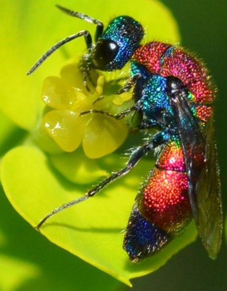 Diese Frage kann man sich bei der Goldwespe stellen, die hier an der Wolfsmilch-Blüte naschte.