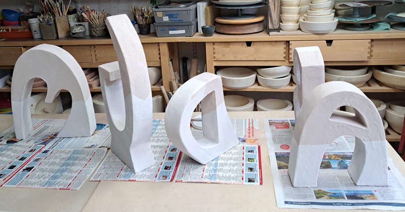 Mein persönlicher “Buchstabensalat”, bereit für den Glasurbrand: