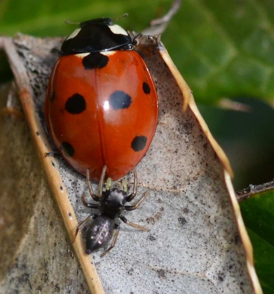Die Kupfrige Sonnenspringspinne klopft mal bei dem Marienkäferchen an.
