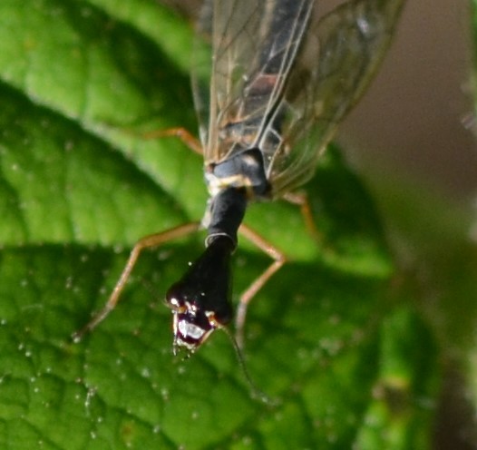 Der Kopf der Kamelhalsfliege. Ihr Schlüpfen war nicht geglückt, ihr einer Flügel war nicht richtig entfaltet gewesen, das weiß ich noch gut.