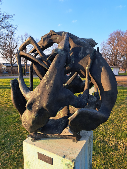 Das ist ja originell, so eine Plastik im Park, wo das eine Alltagsszene sein könnte. Ich deute sie zumindest auch als spielerisch, nur kann ich kaum erkennen, ob es zwei oder drei windhundähnliche “Spielkälber” sind., auf der Abbildung im Wikipedia übrigens ebensowenig, aber es sind noch weitere schöne Terplastiken zu sehen. Ich hatte mal einen ganz ähnlich aussehenden grossen Mischling, der sich immer sehr gefreut hat, wenn er Gelegenheit zu solch freundlichem Getümmel hatte.