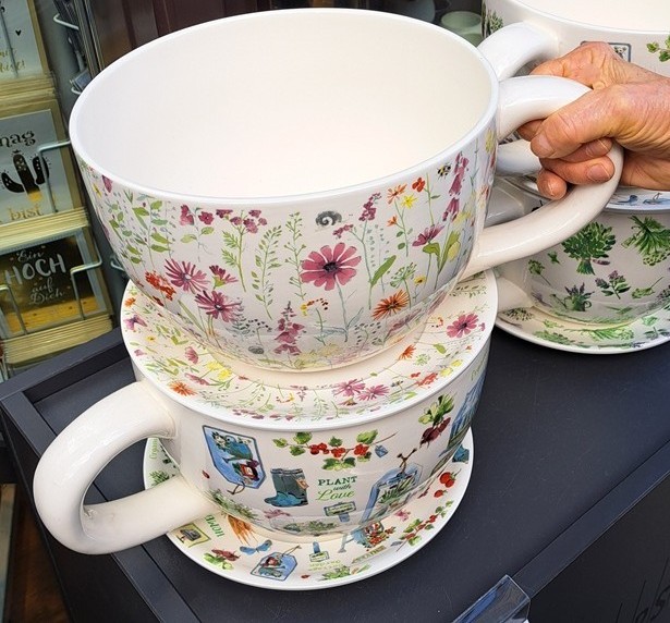 Diese Riesentassen sind wahrlich eher für Suppe oder zur Zier zu gebrauchen, aber sicher nicht für einen feinen Kaffee. :–)