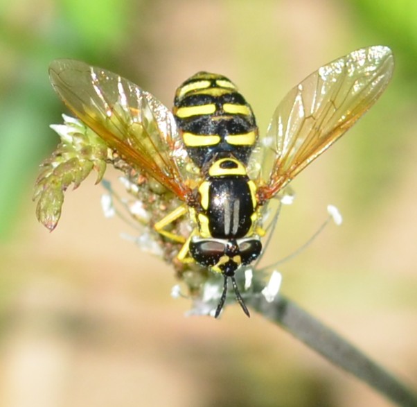 Im 2. Foto sieht man, daß auch der Unterleib gestreift ist. Auch das ja ungewöhnlich, aber so wird vielleicht die Wespenähnlichkeit besser unterstützt.