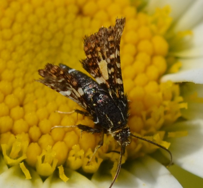 Zum Abschluss einer schweisstreibenden Arbeit in Hof und Garten wurde ich noch belohnt, mit dem Anblick des seltenen Waldreben-Fensterfleckchen Thyris fenestrella auf der Margarite: