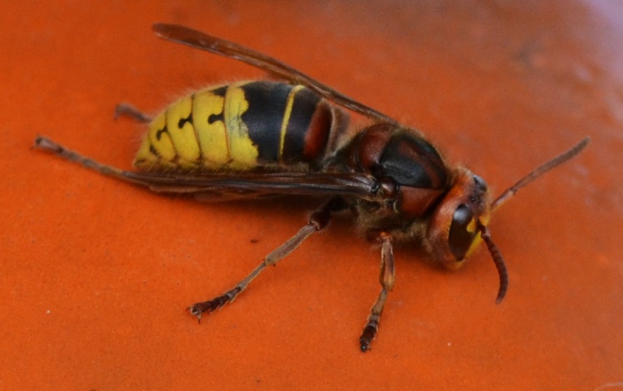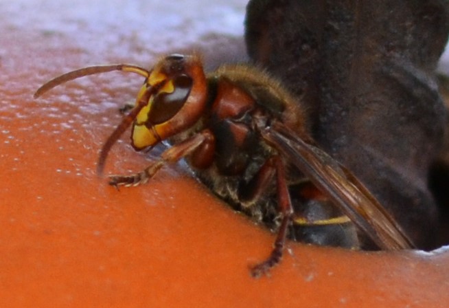 In einer meiner Keramikkugeln, in denen Feldwespen nisten, kriecht immer wieder eine Hornisse hinein.