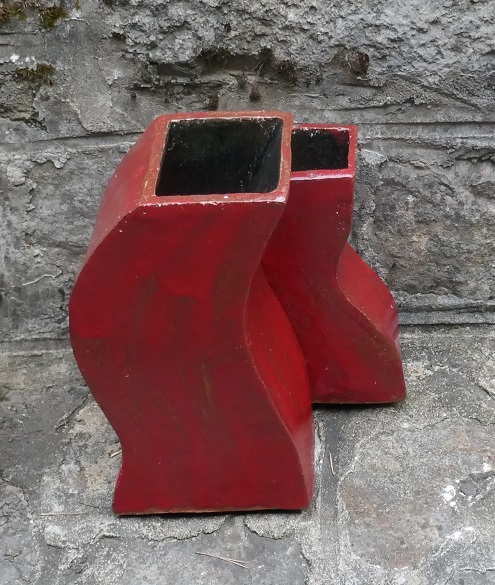 Zwei Vasenobjekte in kirschrot mit tiefblauem Inneren sind nun endlich gebrannt – und können lustig kombiniert werden. Das ist so gedacht, dass sie zusammenstehen und sinnreich zueinandergestellt werden, je nach Laune und Vorliebe und auch mal öfters neu.