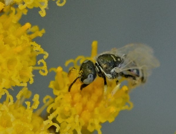 Das Foto dieser wirklich winzigen Wildbiene mit den merkwürdig geformten Augen auf Heiligenkraut gehört zu meinen liebsten Fotos.