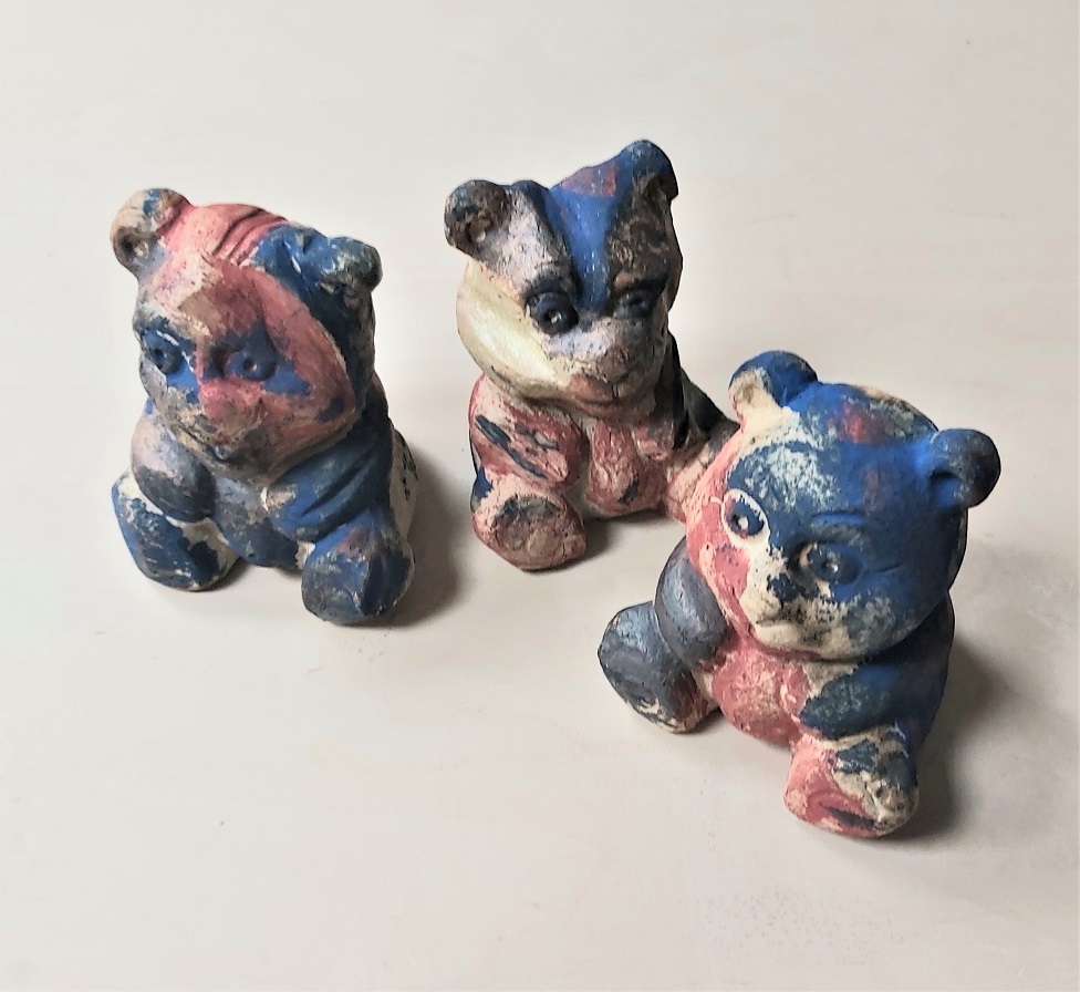 Hier sind meine Bärchen nach dem Glasurbrand. Leider hat sich nur die erste Schicht der Farbpigmente mit den Körperchen verbunden. Die dann darauf liegenden Pigmente lösen sich ab.